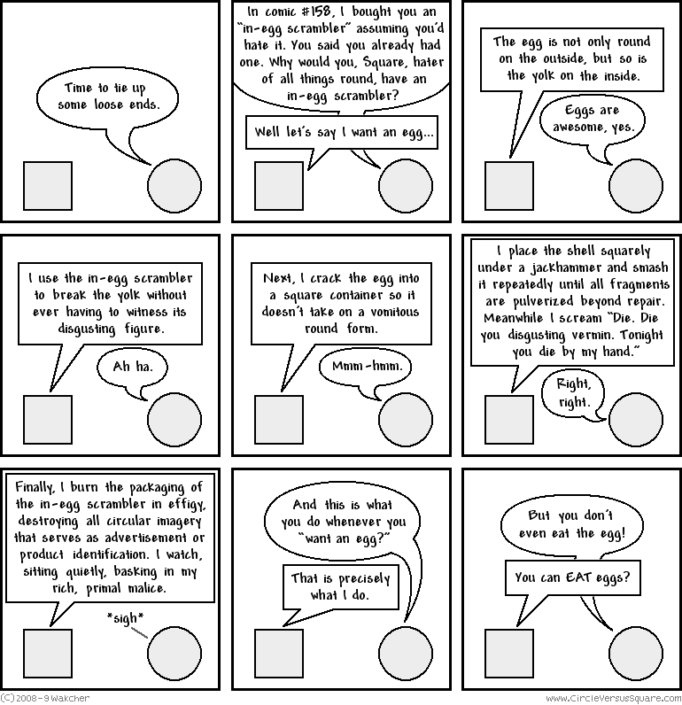 And so you know, yes. Whenever Square "wants an egg" he "acquires" a new in-egg scrambler so he may burn its packaging.