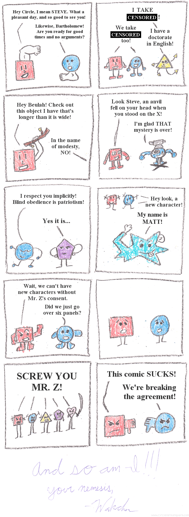 Behold, the true art medium of CRAYON! See Mr. Z, your ideas for my comic are HORRIBLE! And you know what, after ignoring you for so long there's nothing I love more then letting you think you've won just to knock you down. You have NO case! So in the words of Circle AND Square: I hate you! Bring it! Waste your time and take me to court if you have to, cause you've got NOTHING and I'm willing to go the distance to prove it. The fans have spoken, I've spoken, and it all ends right here. I look forward to your idiotic reply, unless you're too chicken to send one. BOOYAH!