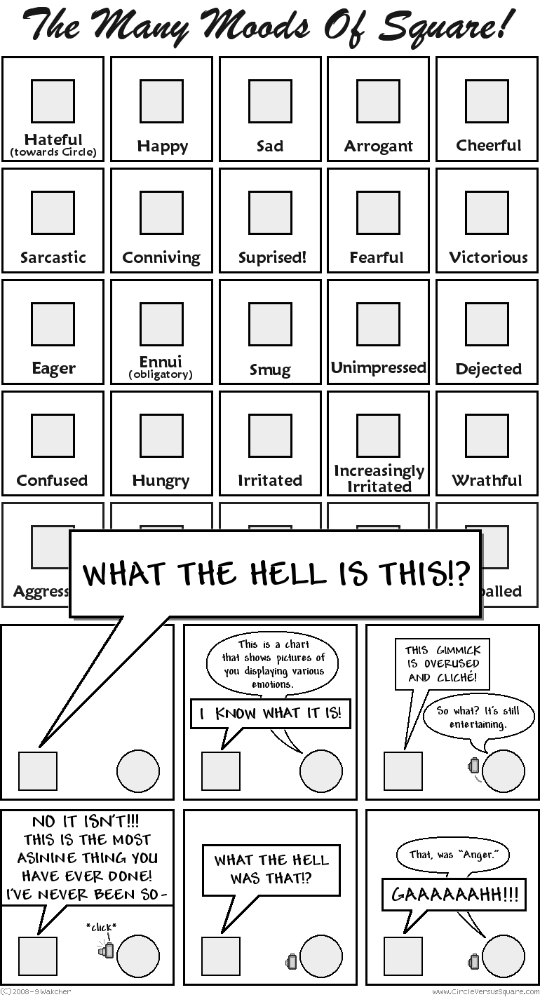Wow! It seems like just 7 months and 22 days ago that I published comic 100, and now we have comic 200! Truth be told, I'm a big fan of these "many moods of" comics, but it's true that you see them all over the place. So I decided to give it my own personal spin :)