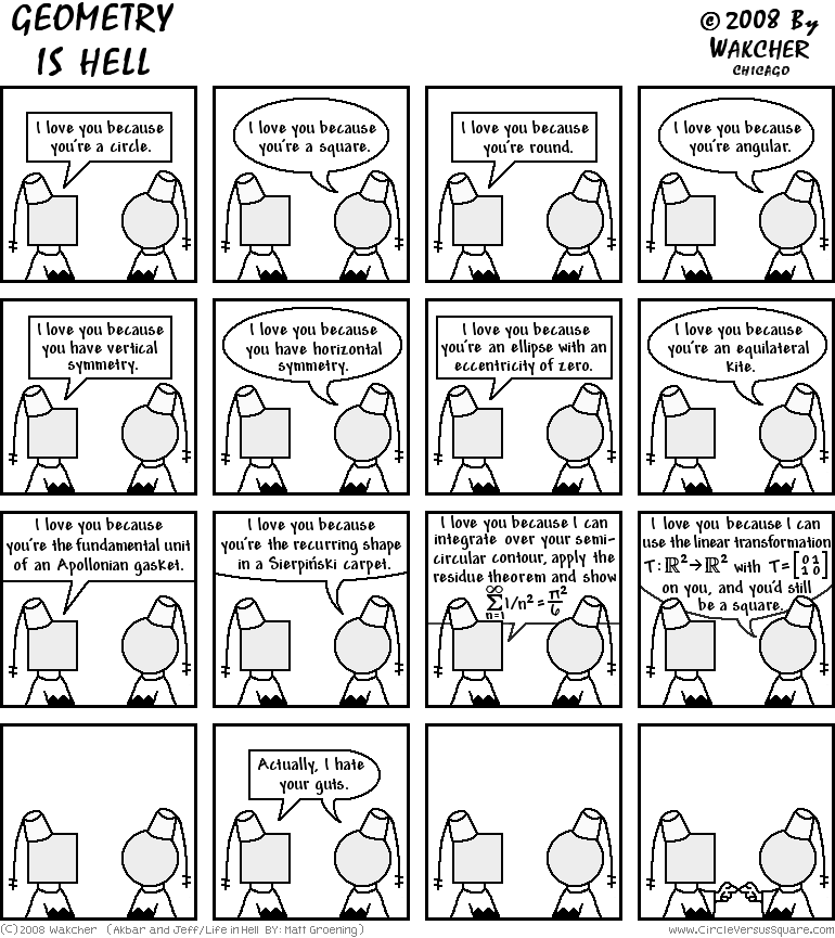 The above comic is a tribute to Matt Groening's (The Simpsons), comic strip Akbar and Jeff. They first appeared in 1984 in his strip "Life in Hell." Groening says Akbar and Jeff are "either brothers or lovers or possibly both," depending on what offends you more. But ultimately, what the strip is really about is relationships in general. Groening states that much of the humor in Akbar and Jeff comes from their constant arguing and criticizing of one another despite being identical. Another big component is that their facial expressions never change, so it's up to the reader to interpret them in. Sound like any other comics you read?