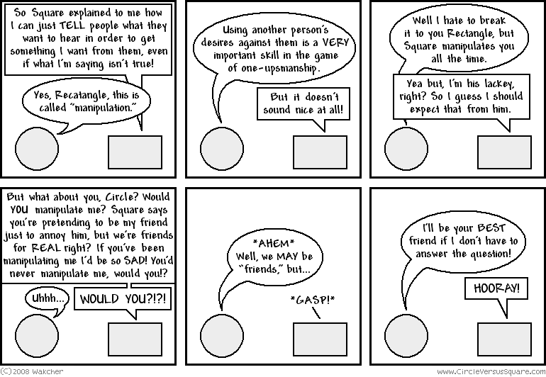 San Diego Comic-Con to promote Circle Versus Square and hobnob with various members of the community. I've never actually been, so it should be phat biscuits! I won't have a booth or anything, but we will be wearing fancy CVS shirts printed up just for the occasion. Who knows, maybe I'll see some of you there! We'll be wearing the only CVS shirts in existence (that I know of) so if you happen to see someone in the crowd with a big square or a circle on their shirt that says "I hate you," and "Bring it," respectively, then you can be pretty sure you're looking at the right guys.