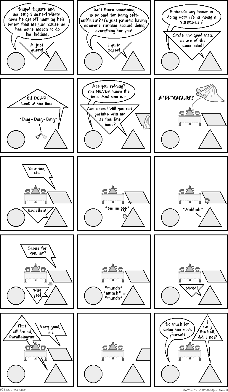 other than Pi, if you count it/him/she?) that does NOT have vertical symmetry (as in, he does NOT reflect on the vertical axis). That means, unlike the other shapes, you can actually tell which direction he is facing! Note how you can tell that he's turned around to leave in the second to last frame of the comic. It's like a whole new world of art! The term "new" here is of course used very loosely.
